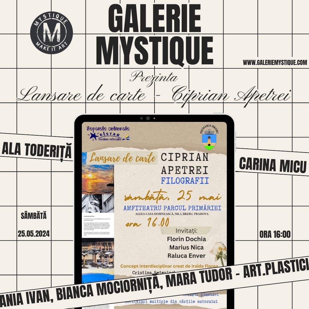 Galeria Mystique a avut onoarea de a participa, pe 25 mai 2024, la un eveniment deosebit în localitatea Brebu, care a marcat lansarea cărții „Filografii”, a autorului Ciprian Apetrei.Evenimentul a