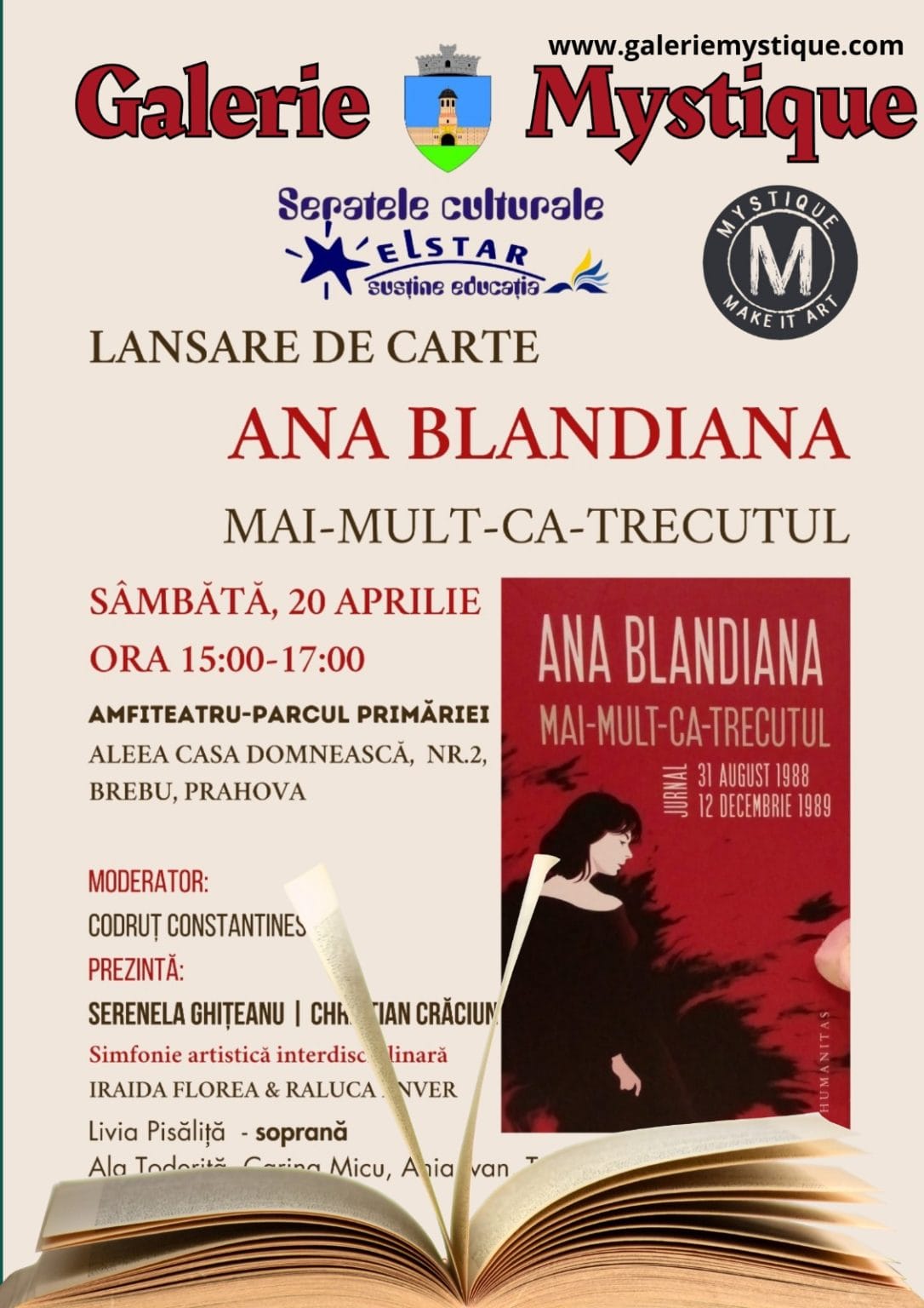 Galeria Mystique a avut plăcerea de a participa la lansarea de carte a distinsei scriitoare Ana Blandiana. Evenimentul s-a desfășurat pe data de 20 aprilie 2024, între orele 15:00 și